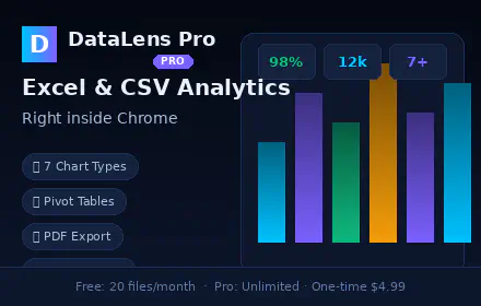 DataLens Pro is a professional data analytics Chrome Extension that lets you analyze, visualize, and export Excel and CSV files directly inside your browser — with zero server uploads and complete privacy.